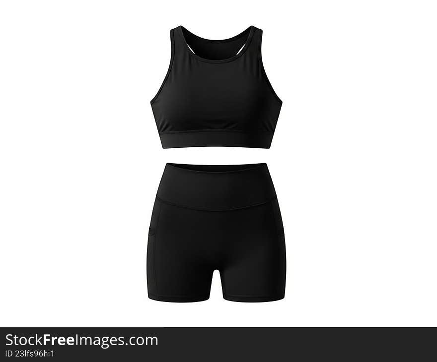 Black Sports Bra And Bike Shorts Set - This Image Features A Sleek Black Sports Bra And Matching Bike Shorts. The Sports Bra Has A Racerback Design And Is Made Of A Stretchy, Moisture-wicking Material Perfect For Workouts. The Bike Shorts Are High-waisted, Providing Support And Comfort During Physical Activities. Both Pieces Are Designed For Optimal Performance And Style Photo