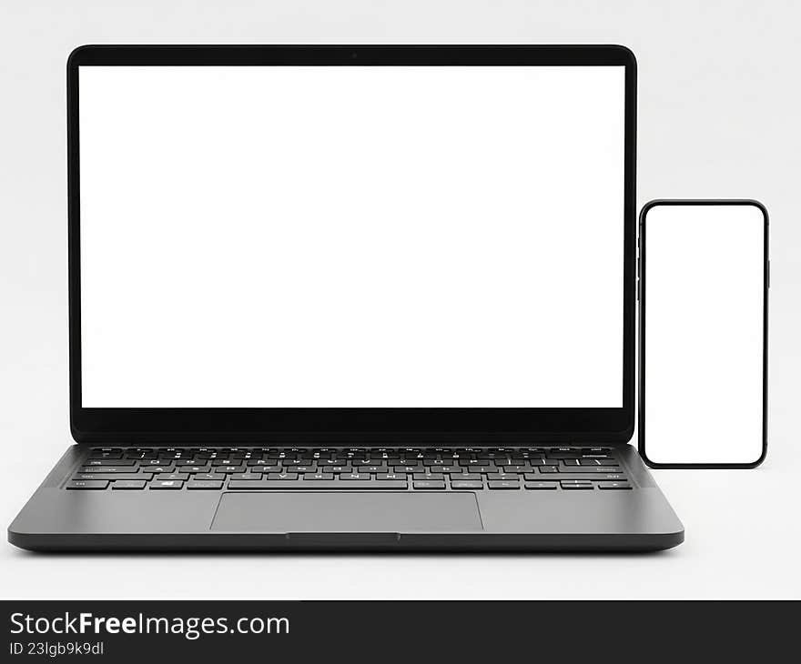 Modern Laptop And Smartphone Display - The Image Showcases A Sleek, Modern Laptop With A Blank Screen Positioned Next To A Smartphone. Both Devices Are Placed On A Plain, Light-colored Background. The Laptop Features A Black Keyboard And A Thin Bezel Around The Screen, While The Smartphone Is Positioned Upright, Displaying A Blank Screen As Well. The Overall Setup Suggests A Minimalist And Contemporary Tech Environment, Ideal For Work Photo