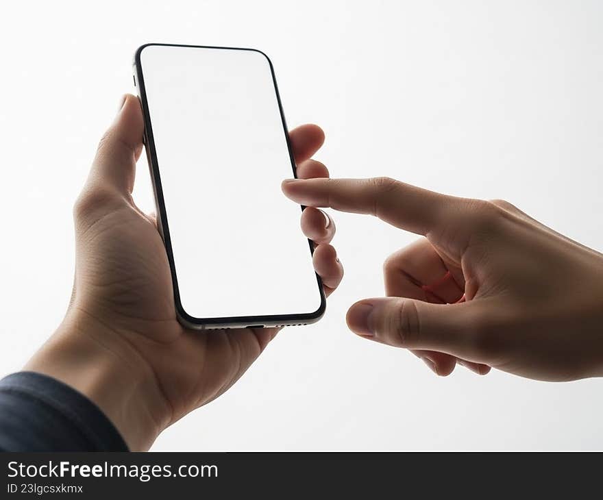 Person Using Smartphone - The Image Shows A Person Holding A Smartphone In Their Left Hand While Using Their Right Hand To Interact With The Screen. The Phone's Screen Is Blank, And The Person Appears To Be Focusing On The Device Photo