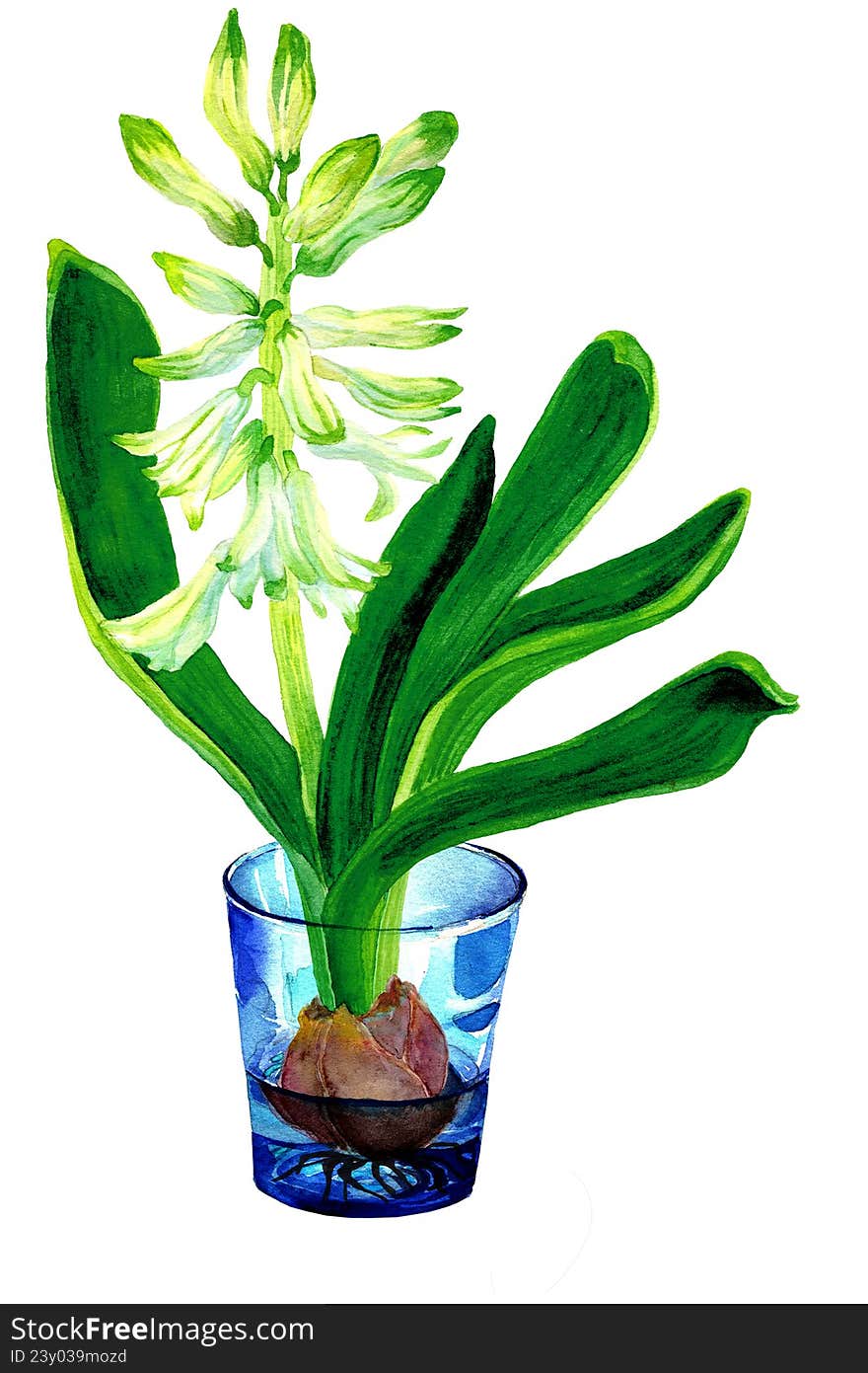 Watercolor Composition With White Hyacinth Flower In Transparent Glass Isolated. Illustration Of Bulb In A Water- Spring Garden Work. Design For Covers, Packaging, Fabric, Season Offer. Photo