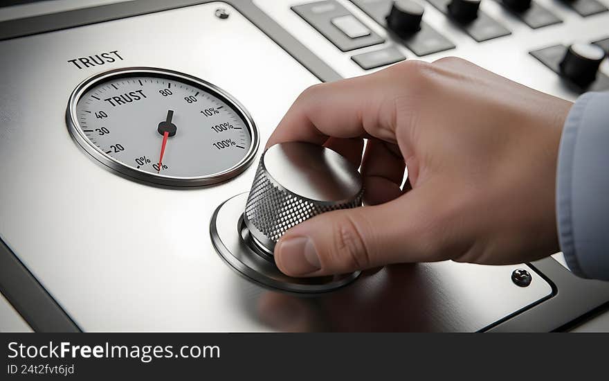 Adjusting Trust Level On Control Panel - A Close-up Of A Control Panel Featuring A Dial Labeled "TRUST" With A Scale From 0 To 100%. The Needle Indicates Approximately 50%. A Person's Hand, Wearing A Long Sleeve, Is Adjusting A Large, Textured Metallic Knob Next To The Dial. The Panel Surface Appears To Be Metallic, With Additional Buttons And Controls Visible In The Background. The Scene Suggests The Concept Of Adjusting Trust Levels Or Settings, Likely In A Metaphorical Or Symbolic Context. Created Ai Photo