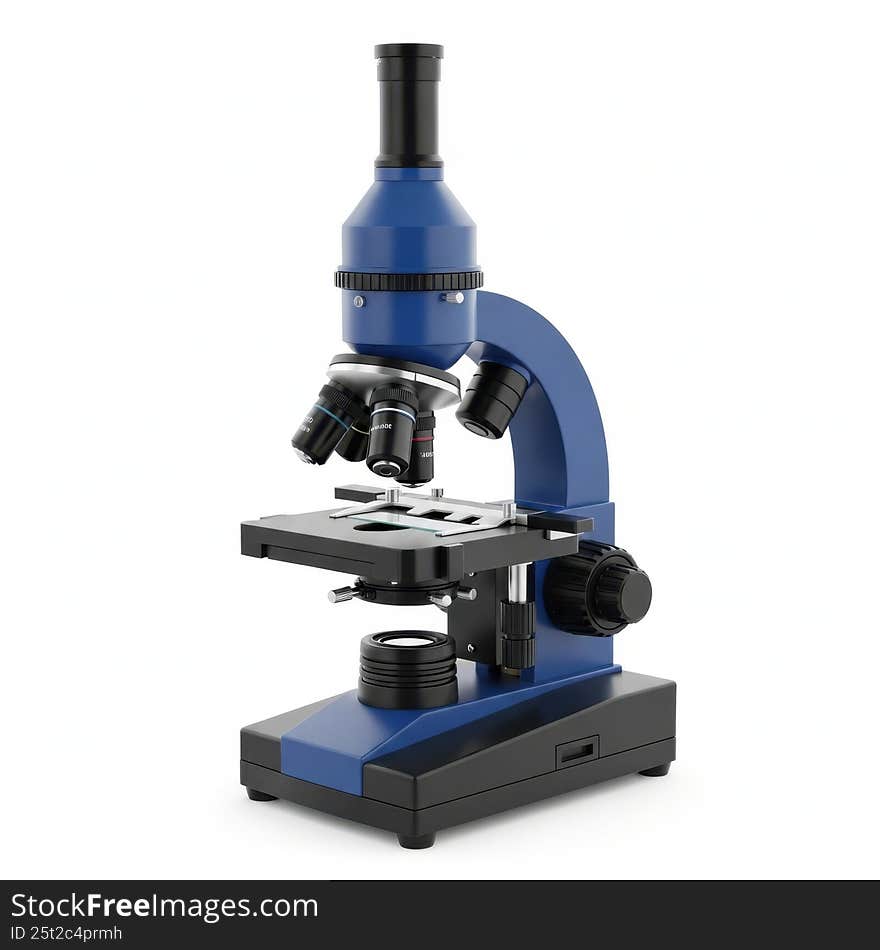 Blue Microscope On White Background - High Resolution JPG File Of A Blue Microscope. The Microscope Features A Blue Body With Black Accents, A Black Eyepiece, And A Black Base. It Has A Rotating Stage And Focus Knob. The Image Showcases The Microscope's Design And Details, Set Against A Plain White Background. Suitable For Use In Design, Web, Print, Advertising, Editorial, Marketing, Presentations, Social Media, And UI Mockups Photo