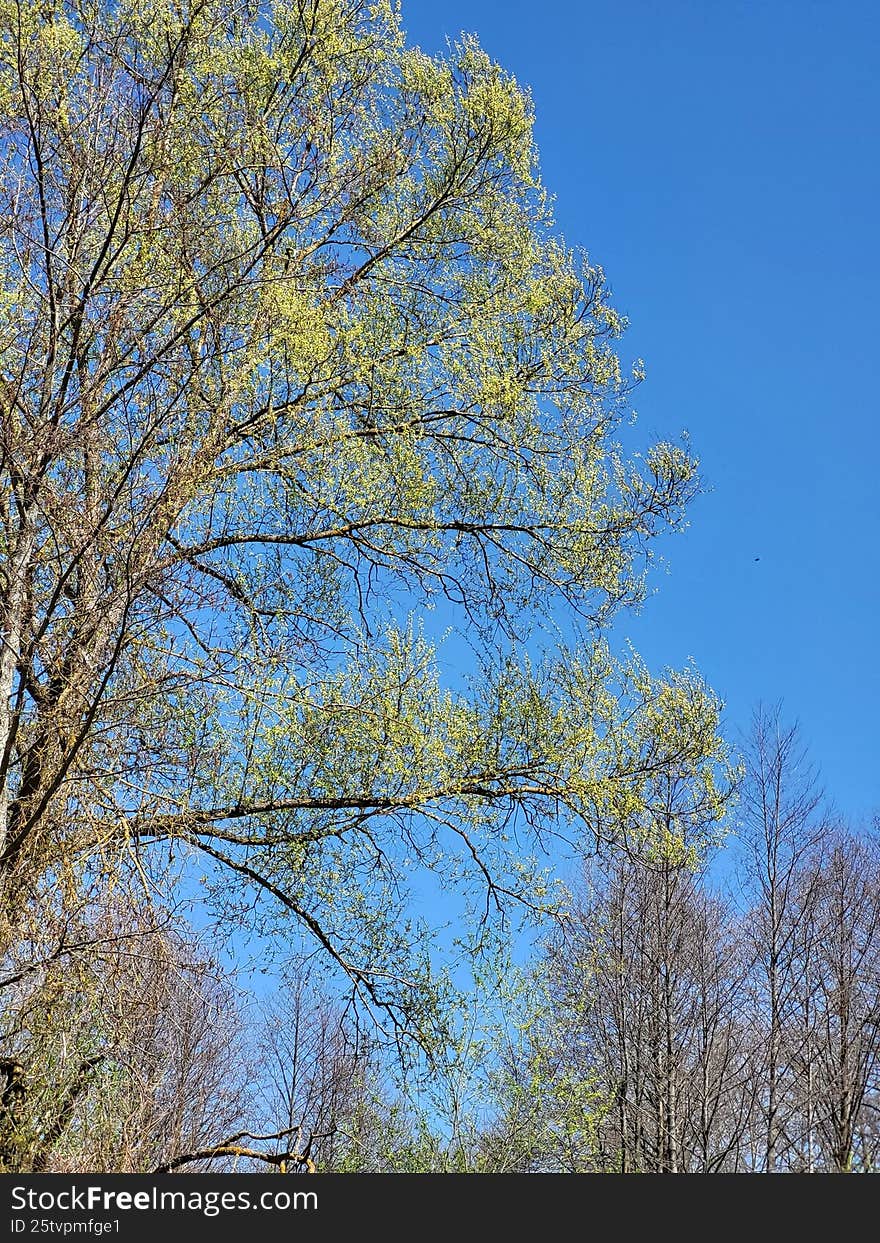 Tree Branches Against Clear Blue Sky In Spring Season - Upward View Of Young Tree Branches Framed By A Vivid Blue Sky. Minimalist Natural Composition Symbolizing Spring And Renewal Photo