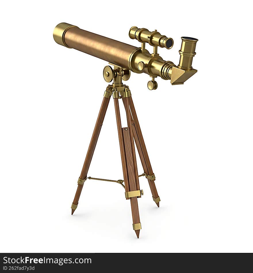 Antique Brass Telescope Isolated On White Background - An Antique Brass Telescope Mounted On A Wooden Tripod. The Telescope Features Intricate Detailing And Multiple Lenses For Viewing. This Vintage Scientific Instrument Is Ideal For Historical Or Educational Imagery Photo