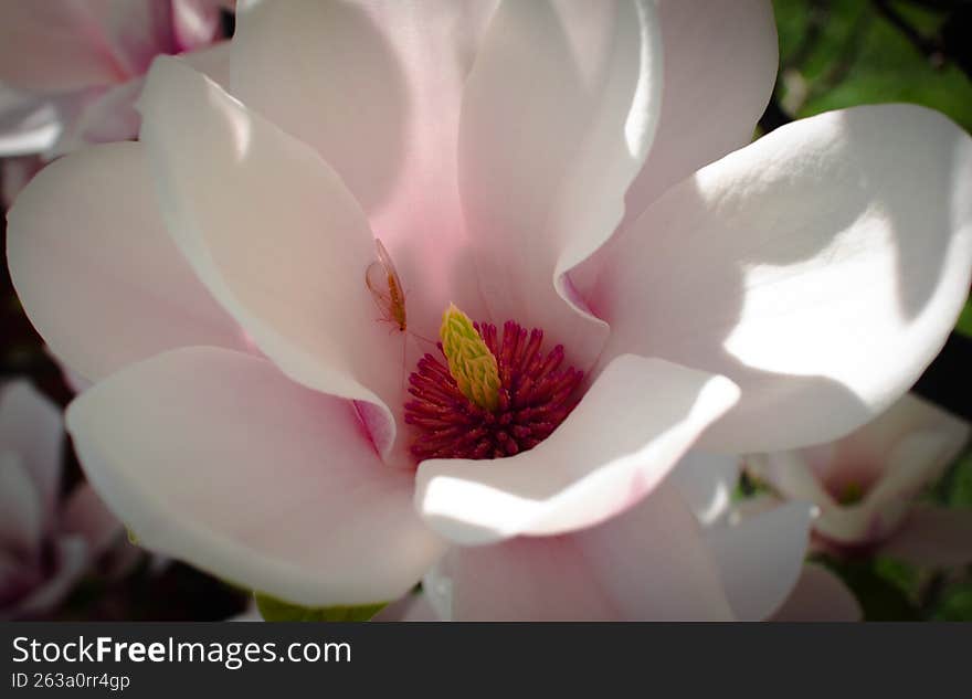 Soft Close-up Of A Pink Magnolia Blossom In Natural Sunlight. Delicate Petals And Floral Center With Shallow Depth Of Field And Gentle Bokeh. Spring Nature Background. Photo