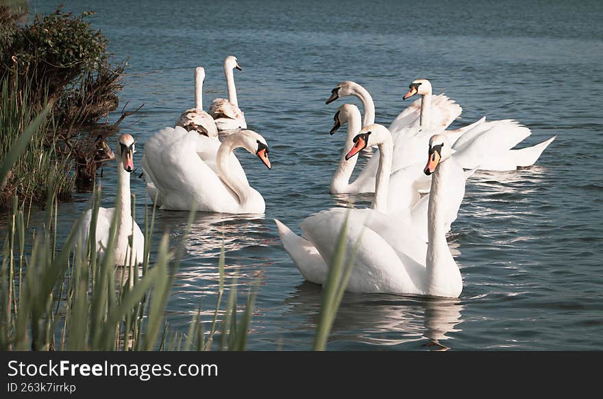 Flock Of White Mute Swans Swimming On Lake Near Reeds - Group Of White Mute Swans Floating And Swimming On Calm Lake Water Near The Shoreline With Reeds. Natural Daylight, Peaceful Wildlife Scene, Birds On Water, Wetland Habitat, Horizontal Composition. Photo