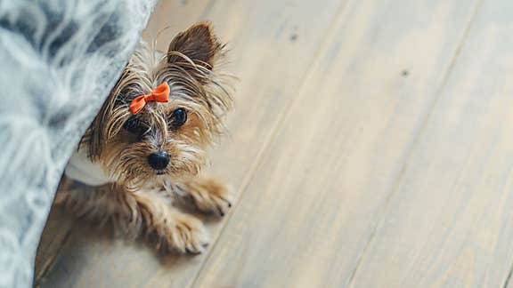 Yorkshire terrier peeks out from under the bed.