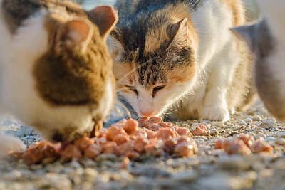 Street cats eating food.