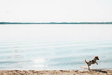 Funny active dog jack russell terrier jumping, running along beach near water on summer sunny day.