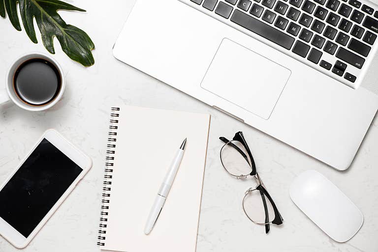 Top view photo of workplace white keyboard mouse open spiral notebook cup of coffee binder clips and pen on white table