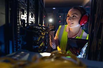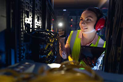 Caucasian female engineer using smartphone flash while inspecting the server in computer server room