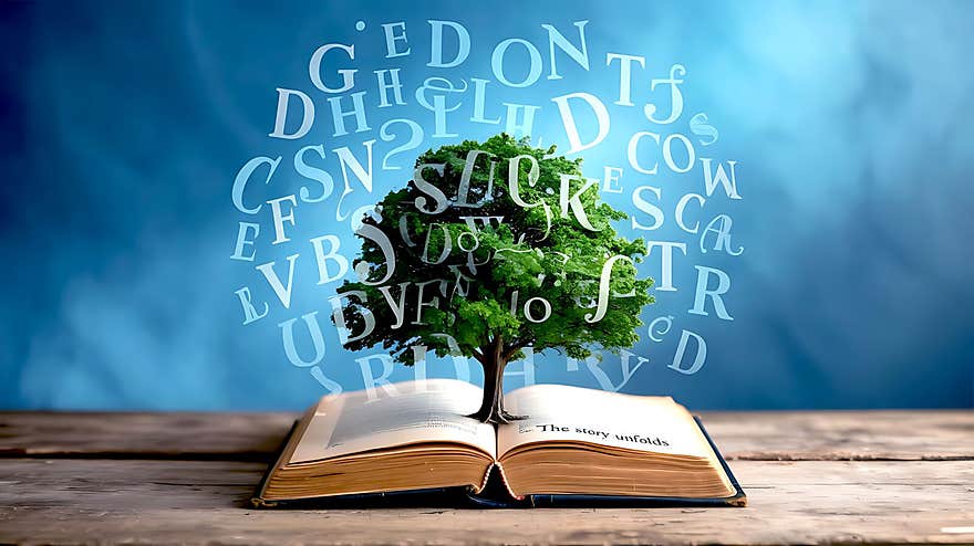 A lush green tree sprouts from an open antique book resting on a rustic wooden surface. Surrounding the tree are translucent, swi