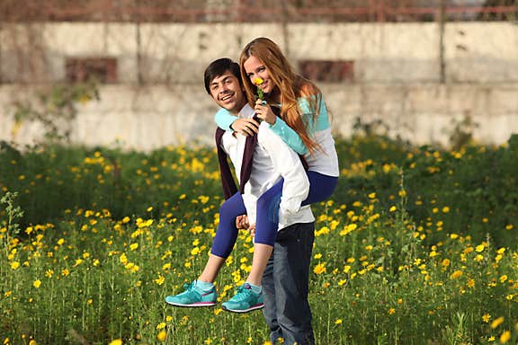 Young couple piggy-backing in meadow