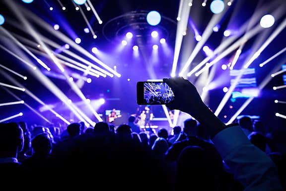 Hand with a smartphone records live music festival, Taking photo of concert stage. Party at nightclub with crowd of people raising