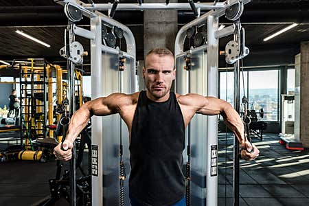 Young active strong sweaty focused fit muscular bodybuilder man chest muscles stretching workout on cable machine in the gym
