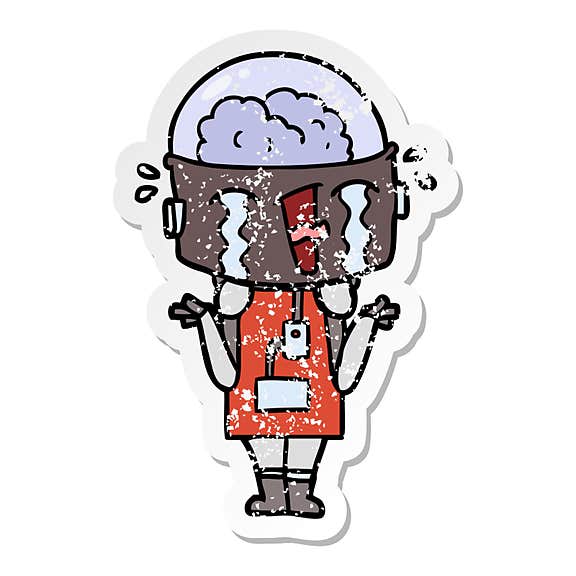 distressed sticker of a cartoon crying robot shrugging shoulders in confusion