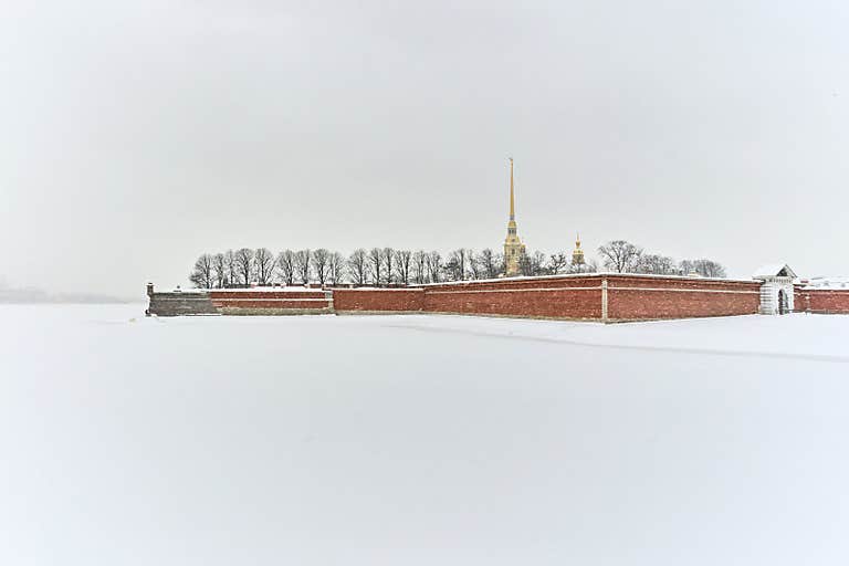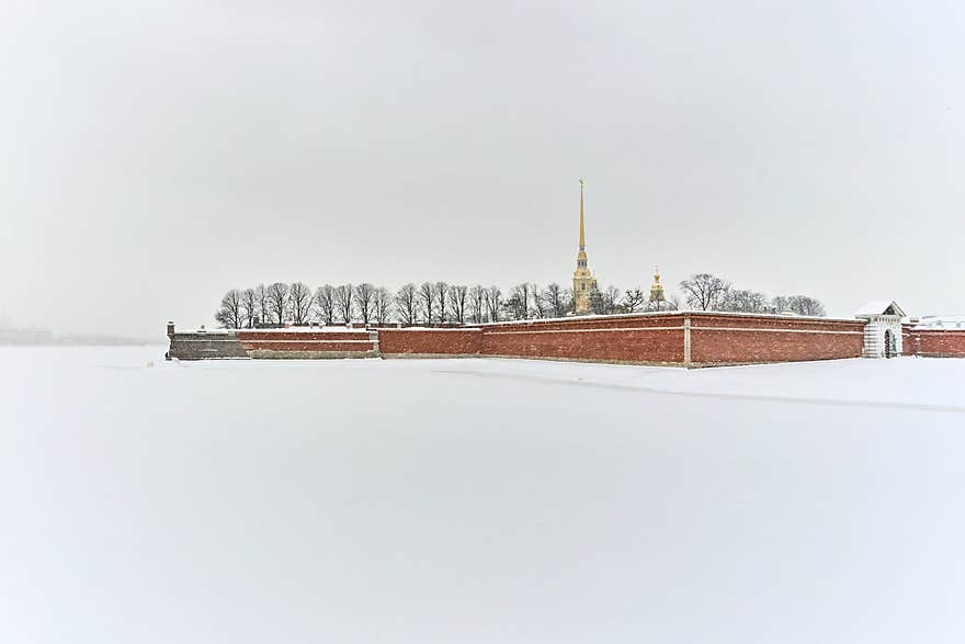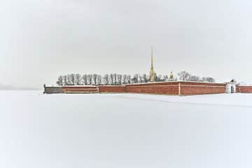 Wide shot of the Peter and Paul Fortress in snowy weather. Stark contrast between the red brick wall and the snow-covered Neva fie