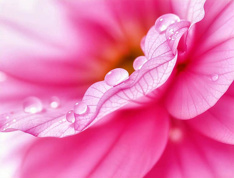 This visual captures the intricate details of a delicate pink flower, adorned with glistening water droplets that convey a sense o