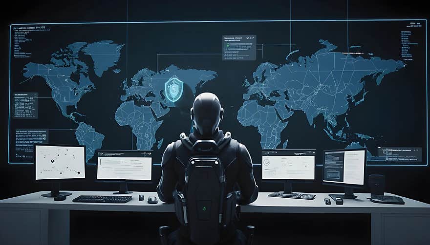 Cyber security specialist monitors global network activity on multiple screens in a dark control room