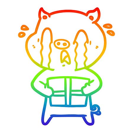 rainbow gradient line drawing crying pig cartoon delivering christmas present