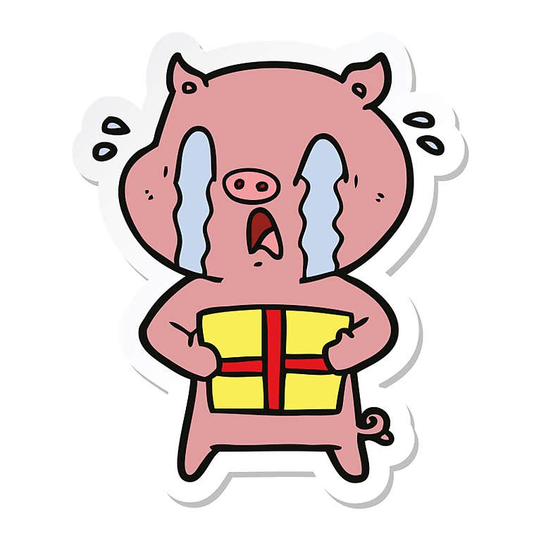 sticker of a crying pig cartoon delivering christmas present