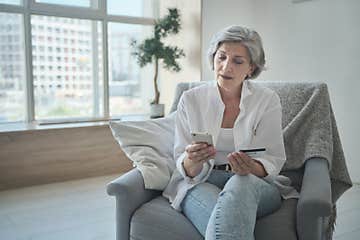 Senior woman spending money in internet websites and stores and making online payments