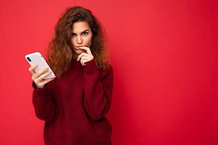 Photo of pretty young female person with curly hair wearing dark red sweater isolated on red background holding mobile