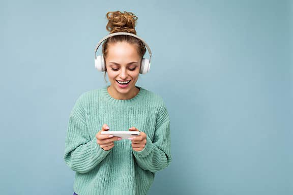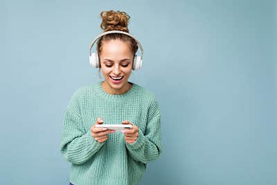 Beautiful positive smiling young woman wearing blue sweater isolated over blue background wearing white bluetooth