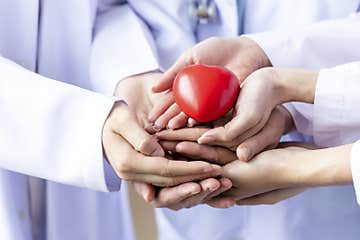 Group of hands holding a red heart. Hand of doctors. donate and insurance