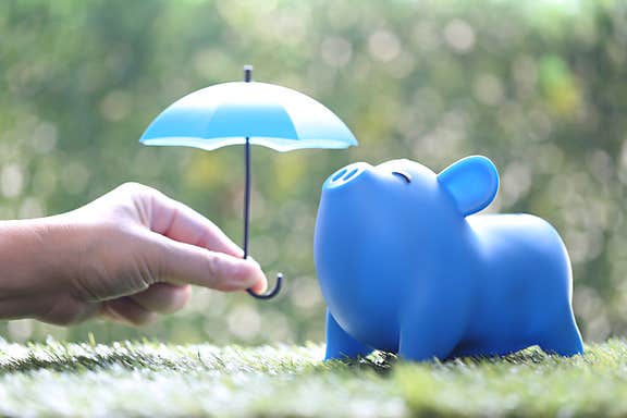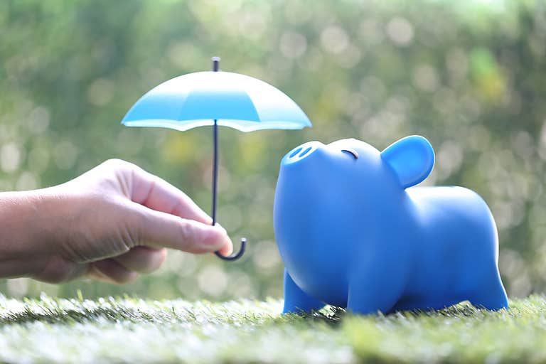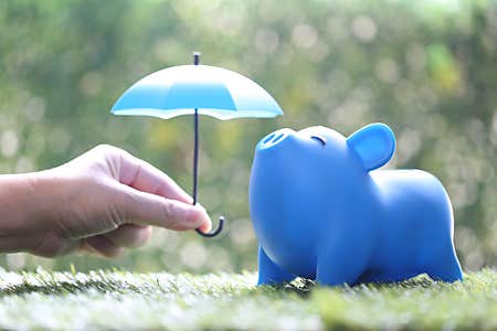 Pink piggy ceramic bank with colorful rainbow umbrella, insurance