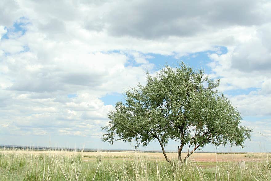 Lonely olive tree on top of a mountain against a blue sky with clouds. Beautiful landscape in Meteora, Greece