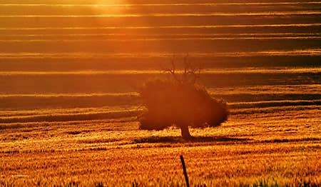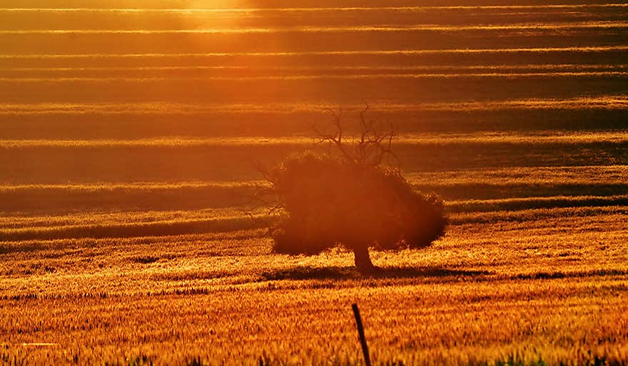 landscape of sunset with black and orange sky and a small lonely silhouette of tree