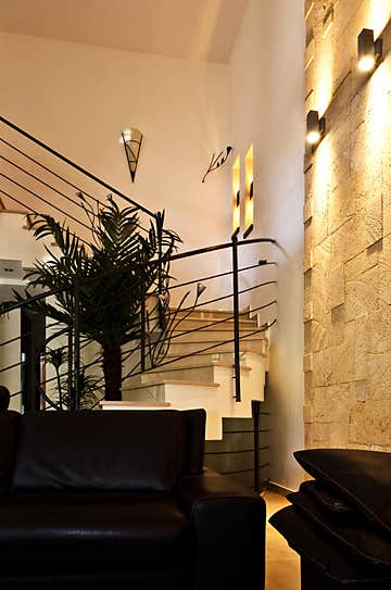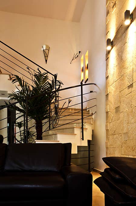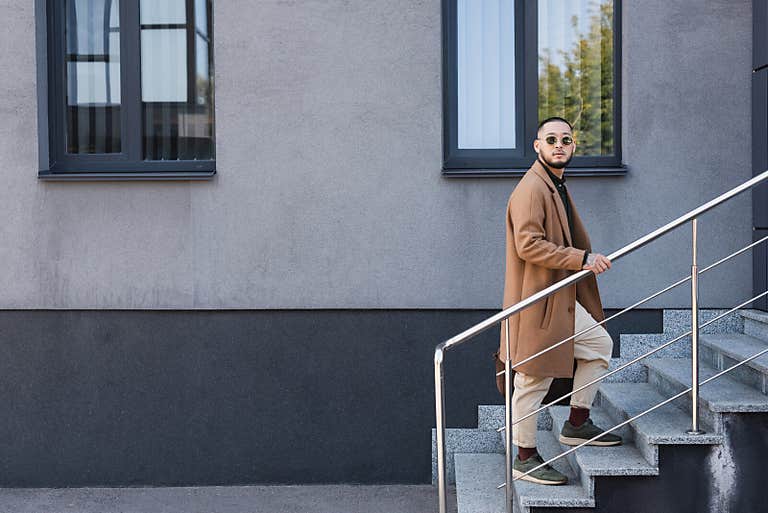Beautiful little girl with funny face expressions playing, climbing up on a wooden stairs