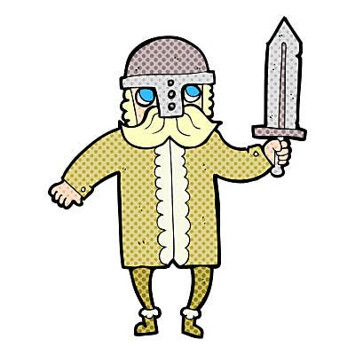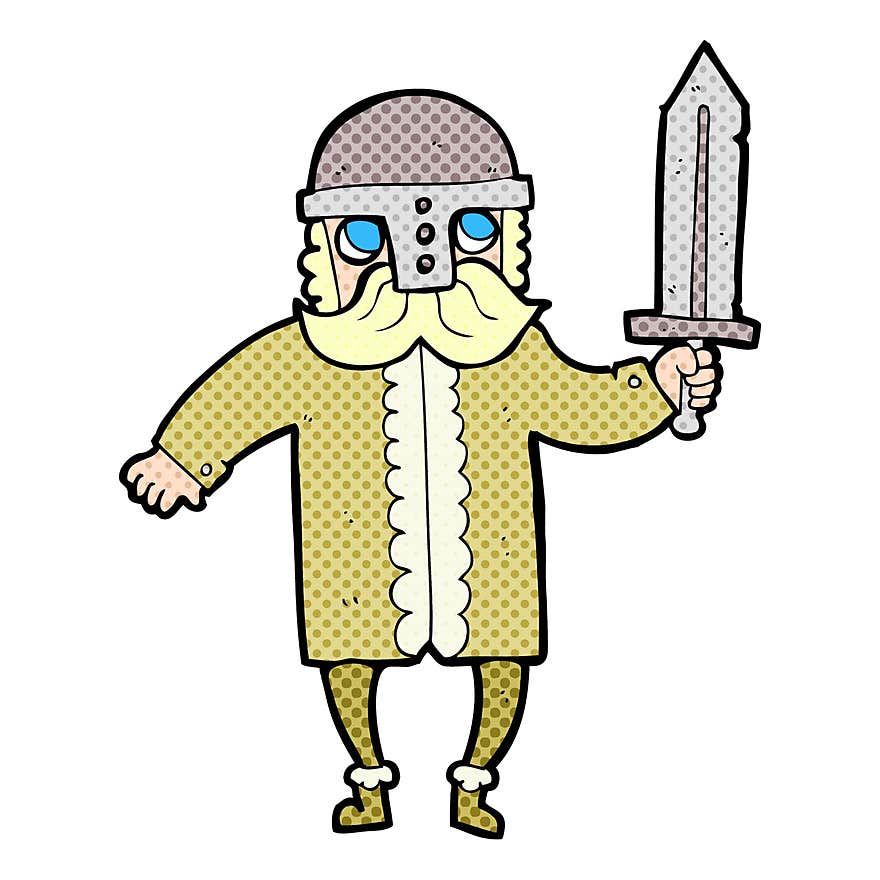 Viking warrior with sword and shield standing near Drakkar on the seashore.