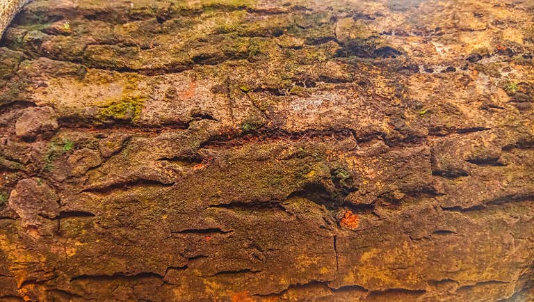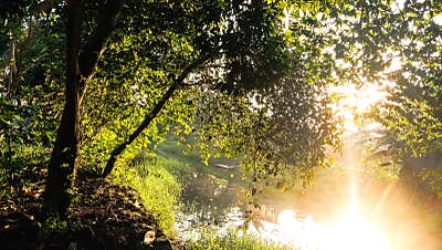The morning atmosphere with lush trees and warm, bright sunshine.