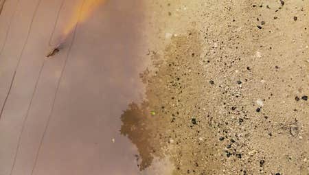 A toy car placed on a wooden block painted to resemble a highway with a morning scene in the background.