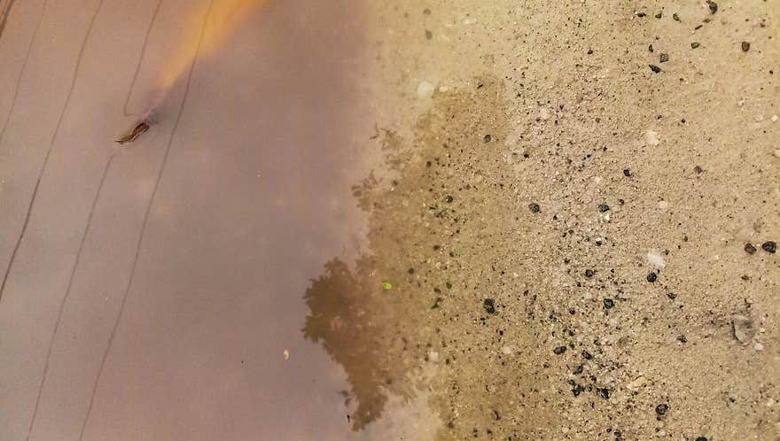 A small river with many trees on its banks and a banana tree growing on the same surface as the river.